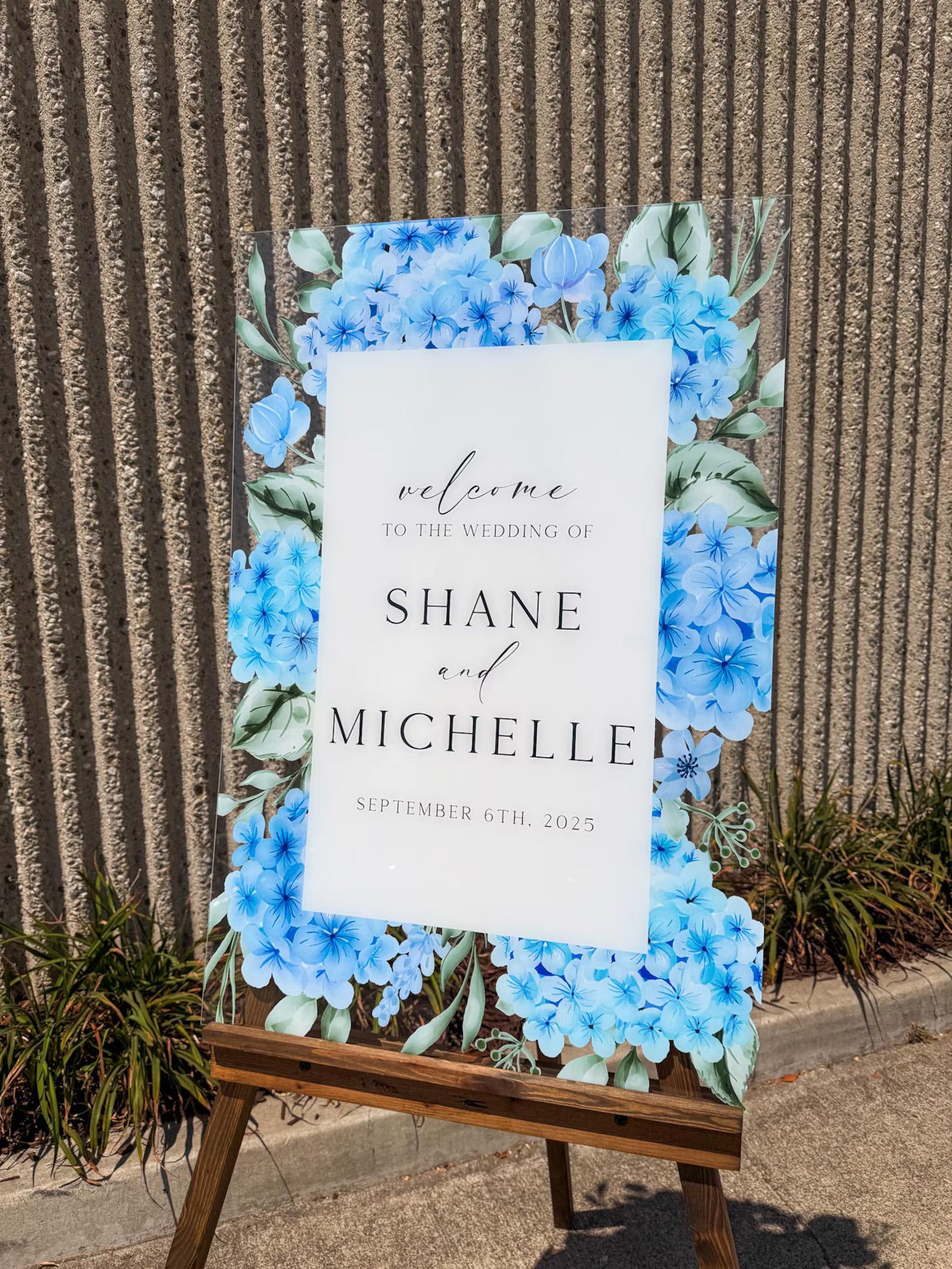This elegant hydrangea wedding acrylic sign is perfect for greeting guests at your boho, rustic, or garden wedding. Personalize it with your names and wedding date to create a unique and timeless keepsake.