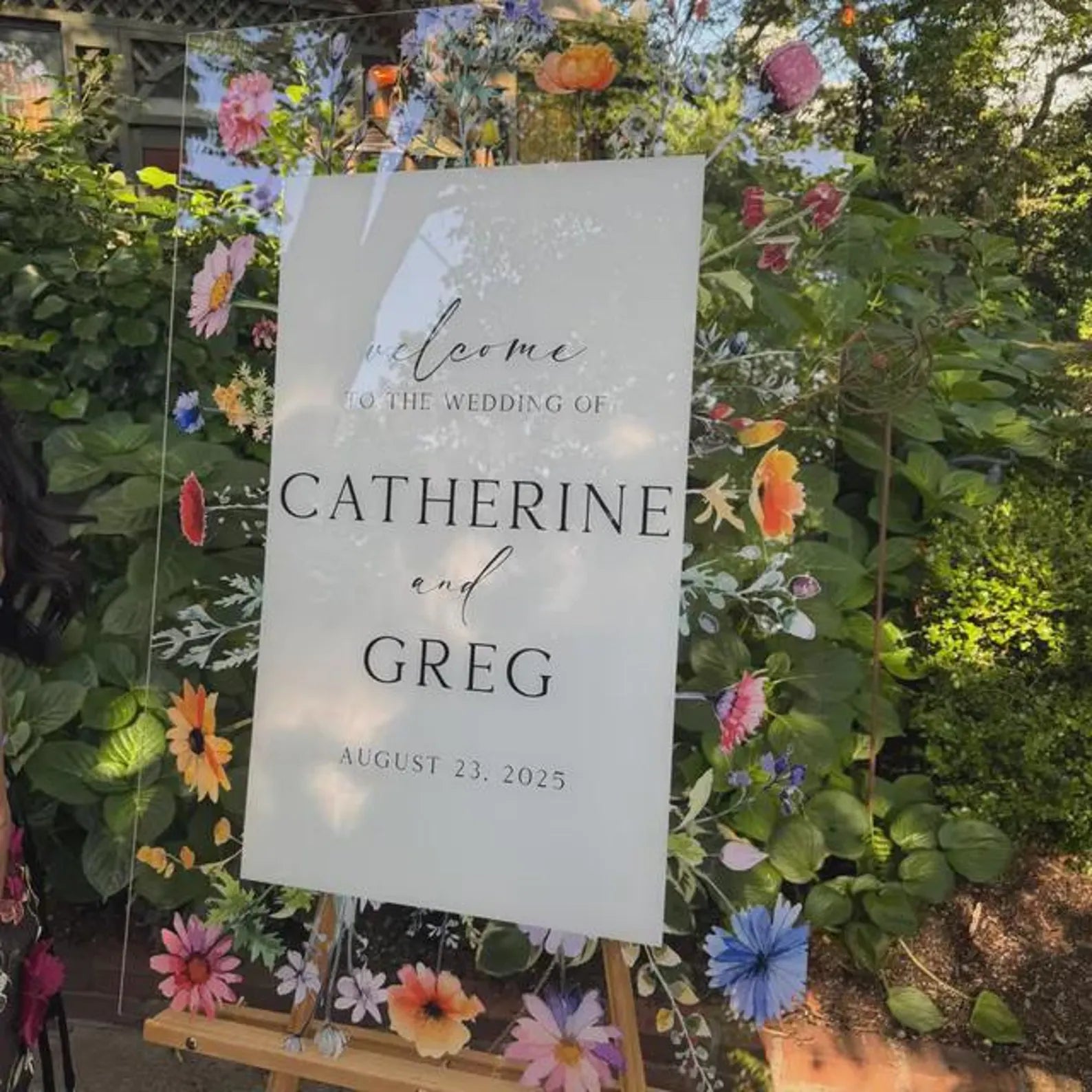 Make a grand entrance at your wedding with this personalized acrylic welcome sign, featuring a delicate wildflower design. Perfect for boho, garden, or rustic-themed ceremonies, this customizable sign welcomes your guests in style. Made from premium, durable acrylic, it offers a sleek, modern look while showcasing intricate floral details. Personalize it with your names and date to create a lasting keepsake.